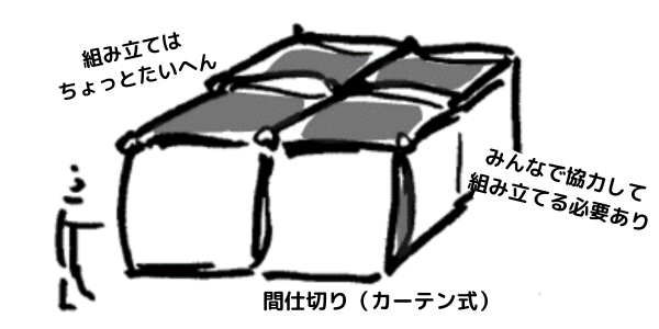“3密対策として、町では、各避難所に間仕切りを用意しています。体育館内に通路を確保しながら並べると、72体(1体に1世帯)が設置可能です。”(葉山町)——1世帯2人で計算すると、体育館内には150人ほどが避難できそうです。また、校舎内の教室(一部を除く)も避難スペースとして利用できるそうです。